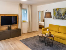 Treffen/Ossiachersee: Moderne, komfortabelt flerfamiliehus "Alpe Maritima by Alps Resorts", på 4 etager. 2 km fra bymidten af Annenheim, 300 m fra søen, 150 m fra skiområdet. I huset: centralvarme. Parkeringsplads ved huset. Supermarked 2 km, restaurant 2 km, havet Ossiachersee 300 m. Skisportanlæg 200 m. Nærliggende attraktioner: Villach 9 km, Tarvis (Italien) 40 km, Bled Slovenien 50 km. Kendte skiområder nås nemt: Gerlitzen 200 m. Kendte søer nås nemt: Wörthersee 28 km. Vandrestier Biosphärenpark Nockberge, Karnische Alpen. Billedet er blot et eksempel. Ferieboligen kan variere i boligareal, plantegning, udstyr og møbler. Feriehjemmet ligger midt i en vintersport og skisportssted med skråninger til enhver smag og på alle niveauer.Interior