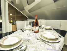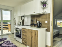 2-værelse-lejlighed 40 m2, på kvist etage, syd vest vendt. Skrå stue/spisestue 16 m2, loftshøjde 100 - 210 cm med 1 dobbelt sovesofa (120 cm, længde 190 cm), sat-TV (fladskærms TV), klimaanlæg. Udgang til terrasse. 1 skrå værelse, loftshøjde 100 - 210 cm med 1 fransk seng (140 cm, længde 200 cm). Skrå, åbent køkken (4 kogeplader, ovn, elektrisk kaffemaskine), loftshøjde 100 - 210 cm. Brus/WC. Terrasse 10 m2. Havemøbler. Udsigt over havet. Til benyttelse: internet (trådløs LAN [WLAN], gratis). Max. belægning: 2 voksne, 2 børn op til 12 år. Desuden er de forkælet med en klar udsigt over havet. Der er en parkeringsplads. Find ud af det eksisterende tv-apparat. Uanset om lokale nyheder eller internationale nyheder, med fjernsynet, er du altid velinformeret.- Faciliteter