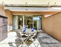 1-værelse-et-værelses lejlighed 30 m2, i stueetagen, vest vendt. Hensigtsmæssig og pæn indrettet: stue/soveværelse med panoramavindue med 1 sovesofa (160 cm, længde 200 cm), TV (fladskærms TV). Udgang til terrasse, retning vest. Kogeniche (2 kogeplader, Brødrister, kedel, elektrisk kaffemaskine, kombi-ovn). Brus, særskilt toilet. El-opvarming, klimaanlæg. Terrasse 25 m2. Havemøbler, liggestole (2). Til benyttelse: vaskemaskine, strygejern hårtørrer. Internet (trådløs LAN [WLAN], ekstra). Parkeringsplads nr. 45. Bemærk venligst: lejlighed ligger på parkeringssiden. TV kun FR. Brandalarm. Kom ind og føl den forfriskende brise af klimaanlægget.- Karakteristika for boligen