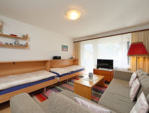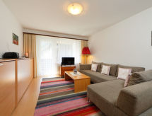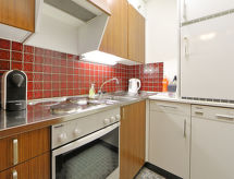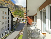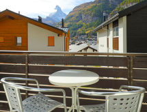 2-værelse-lejlighed 56 m2 i 1. etage, syd vendt. Enkelt og hyggeligt indrettet: stue/soveværelse med 2 klapsenge (90 cm, længde 190 cm), TV og radio. 1 værelse med 1 dobbeltseng (2 x 90 cm, længde 200 cm). (3 kogeplader, ovn, opvaskemaskine, Brødrister, kedel, fryser, elektrisk kaffemaskine, fonduesæt (ost )). Bad/WC. Altan, syd vendt. Altanmøbler. Flotte udsigt over Matterhorn. Til benyttelse: hårtørrer. Internet (trådløs LAN [WLAN], gratis). Bemærk venligst: ikke-ryger lejlighed.- Faciliteter