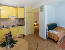 2-værelse-bungalow 30 m2. Stue/spisestue med 1 dobbelt sovesofa (140 cm, længde 200 cm), sat-TV og klimaanlæg. Udgang til terrasse. 1 værelse med 2 senge (80 cm, længde 200 cm). Åbent køkken (2 kogeplader). Brus/WC. Klimaanlæg (ekstra). Terrasse 10 m2 delvis overdækket. Havemøbler. Til benyttelse: internet (trådløs LAN [WLAN], gratis). Parkeringsplads (ekstra, 1 Bil). Maksimum 1 husdyr/hund tilladt. Ejendommen hører til en type ejendom eller lejlighed.- Faciliteter