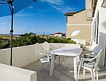 3-værelse-lejlighed 65 m2, på forhøjet stueetage. Pæn indrettet: stue/spisestue med 2 dobbeltsenge (2 x 140 cm, længde 190 cm), TV (fladskærms TV), radio og cd. Udgang til terrasse. 1 værelse med 1 fransk seng (1 x 140 cm, længde 190 cm), brus. 1 værelse med 1 fransk seng (1 x 140 cm, længde 190 cm), brus. Køkken (ovn, opvaskemaskine, 4 Induktionskomfur, mikroovn, fryser). Særskilt toilet. El-opvarming. Stor terrasse, syd vendt terrasse, vest vendt. Havemøbler, liggestole (2). Indskrænkede udsigt over havet. Til benyttelse: vaskemaskine. Internet (trådløs LAN [WLAN], gratis). Bemærk venligst: TV kun DE, FR. Brandalarm. Der er et brusebad, og den daglige rengøring under bruseren tager ikke meget tid, så der er mere tilbage til ferien. Det har et trådløst lokalnetværk (WLAN).- Faciliteter
