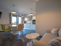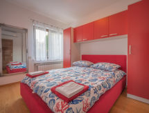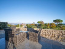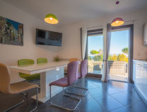 3-værelse-lejlighed 60 m2, i stueetagen, syd vendt. Stue/spisestue med 1 sovesofa (120 cm, længde 155 cm), kabel-TV og internationale TV-kanaler (fladskærms TV), klimaanlæg. Udgang til terrasse. 2 værelse, alle værelser med 1 fransk seng (160 cm, længde 200 cm), klimaanlæg. Åbent køkken (ovn, opvaskemaskine, 4 keramiske kogeplader, fryser, elektrisk kaffemaskine). Bad/bidet/WC. Terrasse 25 m2. Havemøbler, liggestole. Indskrænkede udsigt over havet. Til benyttelse: vaskemaskine, hårtørrer. Internet (trådløs LAN [WLAN], gratis). Garage (2 Biler). Bemærk venligst: privat indgang. Dørtelefon. Sovesofa (120 cm, længde 155 cm) i stue / spisestue kun til 1 barn op til 12 år. Bad i huset. For at holde det køligt om sommeren har dette feriehus aircondition. Hvis vejret ikke spiller, er der også et tv. Du er mere selvstændig med den specielle vaskemaskine.- Faciliteter