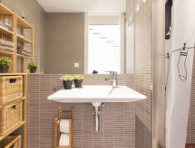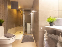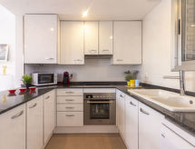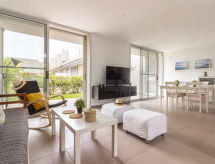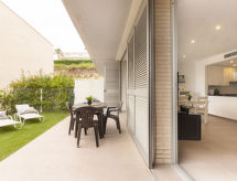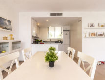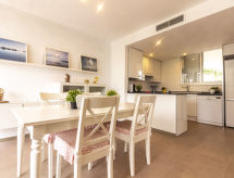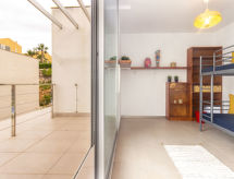 Estrella II: Meget moderne, hyggeligt, komfortabelt rækkehus "Estrella", på 2 etager, bygget i 2011. Boligområde, 110 m fra havet, 100 m fra stranden. Til medbenyttelse: park (indhegnet), stor have (indhegnet), pool (20 x 8 m, Sæsonbestemt tilgængelighed: 01.Jun. - 30.Okt.). Udendørs brus, terrasse. Til alene benyttelse: lille, smuk have. Terrasse, havemøbler. I huset: adgang til internet, trådløs LAN [WLAN], aircondition, vaskemaskine. Parkeringsplads (for 2 biler, begrænset antal) ved huset. Fødevarebutik 1.5 km, restaurant 800 m. Lystbådhavn 2 km, golfbane (18 hul) 5 km, surfskole 20 km. Nærliggende attraktioner: Port Aventura 60 km, Parque natural Delta del Ebro 20 km. Bemærk venligst: bil anbefales. I forlystelsesparken får hele familien deres penge. Eventyr, action og sjov venter dig.Interior