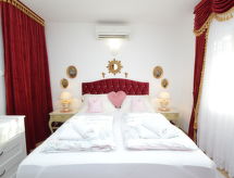 4-værelse-lejlighed 95 m2, i stueetagen, syd vendt. Pæn og hyggeligt indrettet: stue/spisestue 25 m2 med sat-TV (fladskærms TV), klimaanlæg. Udgang til terrasse. 1 værelse med 1 fransk seng (160 cm, længde 200 cm). 1 værelse med 1 fransk seng (160 cm, længde 200 cm), klimaanlæg. Gennemgangsværelse med 2 senge (90 cm, længde 200 cm). Åbent køkken (ovn, opvaskemaskine, 4 keramiske kogeplader, kedel, mikroovn, fryser, elektrisk kaffemaskine). Bad/bidet/WC, særskilt toilet. Terrasse 30 m2, overdækket. Havemøbler, grill. Til benyttelse: vaskemaskine, barneseng. Internet (trådløs LAN [WLAN], gratis). Bemærk venligst: privat indgang. Der er et badekar. Spil til børn i alle aldre er tilgængelige på stedet. Det har en veranda. Velegnet til grillning. En barneseng er tilgængelig. Der er også en mikrobølgeovn.- Faciliteter