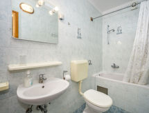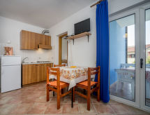 2-værelse-lejlighed 35 m2 i 1. etage. Emner egnet for 2 voksne + 1 barn. Stue/spisestue med 1 sovesofa, sat-TV og klimaanlæg. Udgang til terrasse. 1 værelse med 1 dobbeltseng (2 x 80 cm, længde 190 cm). Åbent køkken (4 kogeplader, elektrisk kaffemaskine). Bad/WC. Varmluftsopvarming. Terrasse 5 m2, overdækket. Havemøbler. Bad i huset. Der er en børnebassin til rådighed. En vaskemaskine er tilgængelig til brug.- Faciliteter