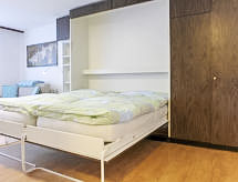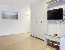 1-værelse-lejlighed 30 m2, i stueetagen, syd vendt. Lys, delvis i år 2017, enkelt og hyggeligt indrettet: stue/soveværelse med 2 dobbelt klapsenge (2 x 90 cm, længde 200 cm), TV. Udgang til have, til terrasse. Åbent køkken (3 kogeplader, ovn, Brødrister, kedel, fryser, elektrisk kaffemaskine, fonduesæt (ost )) med spisebord. Brus/WC. Opvarming. Terrasse, syd vendt. Havemøbler. Flotte udsigt over bjergene. Til benyttelse: hårtørrer. Internet (trådløs LAN [WLAN], gratis). Bemærk venligst: ikke-ryger lejlighed. Er en regelmæssig bruserritual fast forankret i den daglige rutine? Vi kan gøre det, fordi et brusebad er til rådighed.- Faciliteter