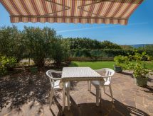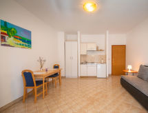 1-værelse-et-værelses lejlighed 31 m2, i stueetagen. Studio med 1 dobbelt sovesofa (160 cm, længde 200 cm), spisebord, køkkenblok og sat-TV (fladskærms TV), klimaanlæg. Udgang til terrasse. Brus/WC. Terrasse 10 m2 delvis overdækket. Havemøbler. Til benyttelse: internet (trådløs LAN [WLAN], gratis).- Faciliteter