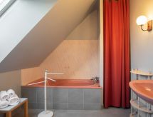 4-værelse-hus 82 m2 på 2 etager, øst vendt. Pæn indrettet: stue/spisestue med TV. Udgang til terrasse. 1 værelse med 1 fransk seng (140 cm). Åbent køkken (4 kogeplader, ovn, opvaskemaskine, mikroovn, fryser, elektrisk kaffemaskine, Kapsler til kaffemasin (Dosette Dolce Gusto) ekstra). Brus, særskilt toilet. Overetage: 1 værelse med 2 senge (90 cm, længde 200 cm). 1 værelse med 1 fransk seng (140 cm, længde 190 cm). Bad/brus/WC. El-opvarming. Terrasse 22 m2 delvis overdækket. Havemøbler, liggestole (2). Til benyttelse: vaskemaskine. Internet (trådløs LAN [WLAN], gratis). Bemærk venligst: 1 husdyr/hund tilladt. TV kun FR. Brandalarm. Du er mere selvstændig med den specielle vaskemaskine. Der findes et trådløst lokalnetværk (WLAN).- Faciliteter