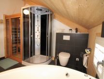 5-værelse-chalet 115 m2. Lys, smagfuld og med meget træ indrettet: indgang. Åben stue med sat-TV (fladskærms TV). Udgang til terrasse. Køkken/alrum (ovn, opvaskemaskine, 4 keramiske kogeplader, Brødrister, kedel, mikroovn, fryser, grill, elektrisk kaffemaskine) med åben kamin og spisehjørne. Brus/WC. Tagetage: 1 værelse med 1 dobbeltseng og sat-TV. Udgang til altan. 1 værelse med 1 dobbeltseng. Udgang til altan. 1 værelse med 1 dobbeltseng. 1 dobbeltværelse med 2 senge. Bad/brus/WC, massagebruser, boblebad. Gas-opvarming. Trægulve. Altan. Altanmøbler, elektrisk grill, liggestole. Herlige panoramaudsigt over bjergene og landskabet. Til benyttelse: vaskemaskine, tørretumbler, hårtørrer. Internet (trådløs LAN [WLAN], gratis). Bemærk venligst: velegnet for familier. Ikke-ryger hus. Maksimum 1 husdyr/hund tilladt. Brandslukker. For jeres velvære kan du nyde boblebadet i feriesæsonen. Velegnet til grill. Der er en brand pit. Det har en internetforbindelse. Et trådløst LAN (trådløst lokalnetværk) er tilgængeligt.- Faciliteter