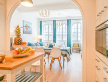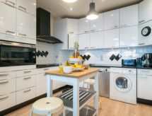 Smuk, lille lejlighedshus "La Maison Basque", på 3 etager. I bymidten fra Biarritz, centrale, livlig beliggenhed, 50 m fra havet, 50 m fra stranden. Fødevarebutik 500 m, supermarked 3.8 km, restaurant 50 m, bageri 200 m, café 50 m, busstoppested "Edouard VII" 10 m, togstation "La Négresse" 4.2 km, sandstrand "La Grande Plage", svømmehal 50 m. Golfbane 2 km, surfskole 50 m. Nærliggende attraktioner: Casino de Biarritz 50 m, Marché des Halles 600 m, Aquarium 1 km, Bayonne 7.5 km, St-Jean-de-Luz 15 km. Vandrestier Le Chemin du Littoral 50 m, La Rhune 26 km. Nøgleoverrækkelsen finder sted på kontoret Interhome.Interior