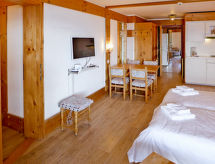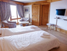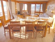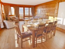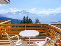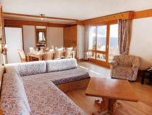 "Le Bristol A30", 5-værelse-lejlighed 133 m2 i 3. etage. Rummelig, komfortabelt og pæn indrettet: stor stue/spisestue med spisebord og TV (fladskærms TV). Udgang til altan, retning syd og retning vest. 1 værelse med skydedør med 1 fransk seng (140 cm). Udgang til altan, retning syd. 1 værelse med 2 senge og bad/WC. Udgang til altan, retning vest. Stor gennemgangsværelse med 2 senge, spisebord, køkkenblok, bad/WC og TV (fladskærms TV). Udgang til altan, retning syd. 1 værelse med 2 senge (90 cm), bad/WC. Udgang til altan, retning nord. Åbent køkken i indgang (ovn, opvaskemaskine, 4 keramiske kogeplader, mikroovn, fryser, raclettegrill). Brus/WC. Stor altan 30 m2, syd vendt og vest vendt, lille altan, syd vendt. Altanmøbler. Meget flotte panoramaudsigt over bjergene og dalen. Til benyttelse: internet (trådløs LAN [WLAN]). Parkeringsplads nr. 13 (overdækket). Bemærk venligst: ikke-ryger lejlighed. Brandalarm. Residence. Der er en overdækket parkeringsplads. Det har en indendørs pool. Det har en opvarmet pool. En tørretumbler er tilgængelig. Der er en ovn til rådighed.- Karakteristika for boligen
