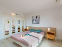 3-værelse-lejlighed 70 m2 i 2. etage. Komfortabelt og pæn indrettet: stue/spisestue med TV og elektriske jalousier. Udgang til altan. 1 værelse med 2 senge (80 cm, længde 190 cm), ventilator og elektriske jalousier. 1 værelse med 1 fransk seng (1 x 160 cm, længde 200 cm), ventilator og elektriske jalousier. Køkken (ovn, opvaskemaskine, 4 gasblus, Brødrister, kedel, mikroovn, fryser, elektrisk kaffemaskine, Kapsler til kaffemasin (senseo) ekstra). Udgang til loggia. Brus, bidet, særskilt toilet. El-opvarming. Altan. Altanmøbler, liggestole (1). Vid udsigt over havet. Til benyttelse: vaskemaskine, strygejern. Internet (trådløs LAN [WLAN], ekstra). Garage, højde 195 cm, bredde 230 cm. Bemærk venligst: velegnet for familier. 1 husdyr/hund tilladt. TV kun FR. Brandalarm. Om morgenen hopper hoppe hurtigt under det ledige brusebad kroppen, sindet og sjælen. Der er en komfur.- Karakteristika for boligen
