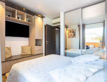 2-værelse-lejlighed 45 m2 i 2. etage. Renoveret i år 2019, pæn og moderne indrettet: stue/spisestue med 1 dobbelt sovesofa (160 cm, længde 190 cm), TV (fladskærms TV). 1 værelse med 1 fransk seng (160 cm, længde 200 cm), TV (fladskærms TV). Udgang til terrasse. Kogeniche (ovn, opvaskemaskine, 2 Induktionskomfur, Brødrister, kedel, mikroovn, fryser, elektrisk kaffemaskine). Bad, særskilt toilet. Klimaanlæg. Terrasse 35 m2, overdækket, stor terrasse 100 m2. Havemøbler, grill, liggestole (4). Udsigt over havet. Til benyttelse: vaskemaskine, pengeskab, strygejern hårtørrer. Internet (trådløs LAN [WLAN], gratis). Parkeringsplads nr. 734 (overdækket), højde 180 cm, bredde 200 cm. Bemærk venligst: ikke-ryger lejlighed. Brandalarm. 83119002433DP Residence. Der er et badekar. Praktisk med elevatoren til hoveddøren. Vores have venter på dig for en dukkert i afslapningen. Tilbyder spektakulær udsigt over havet. For at holde det køligt om sommeren har dette feriehus aircondition. Velegnet til grillning. Der er en pool.- Karakteristika for boligen