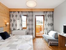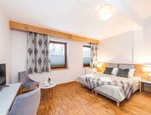 "Sun & Snow studio dla 3 osób", 1-værelse-et-værelses lejlighed 22 til 35 m2. Stue/soveværelse med 3 senge og fladskærms TV. Åbent køkken (1 Induktionskomfur, kedel, elektrisk kaffemaskine). Brus/WC. Opvarming, gas-opvarming. Udsigt over landskabet. Til benyttelse: hårtørrer. Internet (trådløs LAN [WLAN]). Vi tilbyder også vores gæster morgenmad. Der er en indendørs pool.- Faciliteter