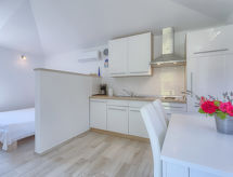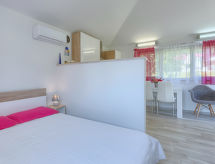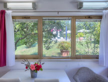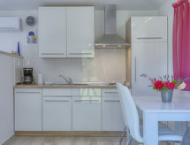 1-værelse-hus 30 m2. Stue/soveværelse med 1 fransk seng (160 cm, længde 200 cm), sat-TV (fladskærms TV), klimaanlæg. Åbent køkken (2 kogeplader, elektrisk kaffemaskine) med spisebord. Brus/WC. Klimaanlæg (ekstra). Terrasse 15 m2. Havemøbler. Udsigt over have. Til benyttelse: internet (trådløs LAN [WLAN], gratis). Et bad er til stedet. Kun shampooed hurtigt og bruser og allerede kan starte en ny dag med ferie. Der er internetforbindelse.- Faciliteter
