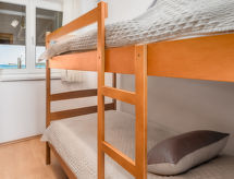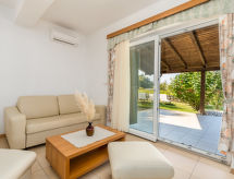 "Mare 2", 3-værelse-lejlighed 50 m2, i stueetagen. Pæn og moderne indrettet: stue/spisestue 18 m2 med 1 dobbelt sovesofa, sat-TV og klimaanlæg. Udgang til terrasse. 1 værelse med 1 dobbeltseng (160 cm, længde 200 cm). 1 værelse med 1 x 2 køjesenge. Åbent køkken (4 kogeplader, opvaskemaskine, mikroovn, fryser). Brus/WC. Terrasse 25 m2, overdækket. Havemøbler. Flotte udsigt over havet. Til benyttelse: pengeskab. Internet (trådløs LAN [WLAN], gratis). Parkeringsplads. Den afslapning og livsstilen i haven er uundværlig på ferie. Overrasket af en storslået udsigt over havet. Kom ind og føl den forfriskende brise af klimaanlægget. En veranda er tilgængelig. Der er en opvarmet pool. Der er en børnebassin til rådighed. Der er internetforbindelse.- Faciliteter