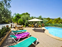 "Maria", 4-værelse-hus 140 m2. Komfortabelt og hyggeligt indrettet: stue/spisestue med sat-TV, radio, stereoanlæg, DVD, klimaanlæg og varmluft opvarming. 1 dobbeltværelse med panoramavindue med 2 senge (90 cm, længde 190 cm), bad/WC, vaskekumme, klimaanlæg og varmluft opvarming. 1 stort dobbeltværelse med panoramavindue med 1 fransk seng (150 cm, længde 190 cm), ventilator. 1 dobbeltværelse med 2 senge (90 cm, længde 190 cm), klimaanlæg og varmluft opvarming. Køkken (4 kogeplader, ovn, opvaskemaskine, Brødrister, kedel, mikroovn, elektrisk kaffemaskine) med spisebord. Bad/bidet/WC. Klimaanlæg, vandkoger. Terrasse 40 m2, have, 90 m2. Havemøbler, grill, liggestole (6). Flotte udsigt over bjergene. Til benyttelse: vaskemaskine, barneseng til 3 år. Internet (trådløs LAN [WLAN], gratis). Parkeringsplads. Velegnet for familier. Maksimum 2 husdyr/hunde tilladt. VT447 Der er et badekar. Den undertrykkende varme kan lægge en tung belastning på krop og sind. Derfor er lokalerne udstyret med aircondition. Det har en pool. Der er en privat pool. En dvd-afspiller er tilgængelig.- Faciliteter