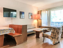 1-værelse-lejlighed 33 m2 i 4. etage, syd vendt. Stue/spisestue med 2 vægklapsenge og TV. Kogeniche i indgang (3 kogeplader, ovn, elektrisk kaffemaskine). Bad/WC. Altan. Havemøbler. Til benyttelse: telefon. Internet (trådløs LAN [WLAN], gratis). Bemærk venligst: ikke-ryger lejlighed. Bad i huset. En reception er til din rådighed for denne ferieudlejning. Du kan tage elevatoren til gulvet i lejligheden.- Faciliteter