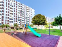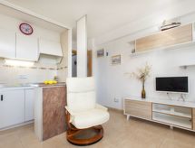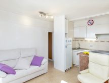 "Med", 3-værelse-lejlighed 40 m2. Lys, hensigtsmæssig indrettet: stue/spisestue med spisebord og digital TV. Udgang til terrasse. 1 dobbeltværelse med 1 fransk seng (135 cm, længde 190 cm). 1 værelse med 1 udtræksseng (2 pers. 2 x 80 cm, længde 190 cm). Kogeniche (2 Induktionskomfur, Brødrister, kedel, mikroovn, fryser, elektrisk kaffemaskine). Brus/WC. Intet opvarmningsalternativ. Havemøbler. Udsigt over byen. Til benyttelse: vaskemaskine, strygejern højstol, barneseng til 2 år, hårtørrer. Internet (trådløs LAN [WLAN], gratis). Bemærk venligst: velegnet for familier. 1 husdyr/hund tilladt. TV kun ES. HUTG063803 Ejendom med elevator. En pool er tilgængelig. Huset er også udstyret med en børnebassin.- Faciliteter