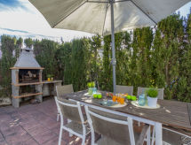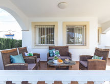 "MIRAMAR", 4-værelse-hus 89 m2. Komfortabelt og pæn indrettet: stue/spisestue med spisebord og sat-TV (fladskærms TV), elektrisk opvarming og klimaanlæg. Udgang til havesideplads. 1 værelse med 1 fransk seng og bad/bidet/WC. 2 værelse, alle værelser med 2 senge. Køkken (ovn, 1 keramiske kogeplade, Brødrister, mikroovn, fryser, elektrisk kaffemaskine). Brus/WC. Klimaanlæg, varmluftsopvarming. Havemøbler, grill, liggestole, loggia. Til benyttelse: vaskemaskine, strygejern. Internet (trådløs LAN [WLAN], gratis). Parkeringsplads, garage ved huset. Velegnet for familier. 2 husdyr/hunde tilladt. HUTTE001423 En veranda er tilgængelig. Det har en privat pool. For at forberede noget hurtigt selv er en mikrobølgeovn klar.- Karakteristika for boligen
