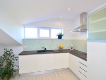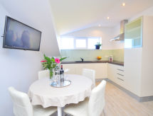 3-værelse-lejlighed 50 m2, på kvist etage. Stue/spisestue med 1 sovesofa og sat-TV (fladskærms TV), klimaanlæg. 1 værelse med 1 fransk seng (160 cm, længde 200 cm). Udgang til altan. 1 værelse med 2 senge (90 cm, længde 200 cm). Udgang til altan. Åbent køkken (4 kogeplader). Brus/WC. Klimaanlæg, varmluftsopvarming (ekstra). Altan 15 m2. Havemøbler. Flotte panoramaudsigt over havet og landskabet. Til benyttelse: internet (trådløs LAN [WLAN], gratis). Udsigt over havet og beliggenheden er smuk. Legepladsen, som er egnet til børn, er tilgængelig. Det har en internetforbindelse.- Faciliteter
