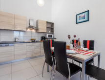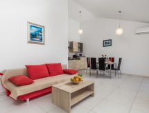 3-værelse-lejlighed 51 m2 i 2. etage, nord vendt. Stue/spisestue 33 m2 med 1 dobbelt sovesofa, sat-TV og klimaanlæg. Udgang til altan. 1 værelse med 1 dobbeltseng (2 x 80 cm, længde 200 cm). 1 værelse med 1 fransk seng (140 cm, længde 200 cm). Åbent køkken (opvaskemaskine, 4 keramiske kogeplader, mikroovn, elektrisk kaffemaskine). Brus/WC. Altan 16 m2. Altanmøbler. Udsigt over havet. Den undertrykkende varme kan lægge en tung belastning på krop og sind. Derfor er lokalerne udstyret med aircondition. Det har en parkeringsplads. Der er en børnepool.- Faciliteter