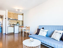 1-værelse-et-værelses lejlighed 22 m2 i 13. etage, nord vest vendt. Lys, renoveret i år 2017, enkelt og moderne indrettet: stue/soveværelse med 1 dobbelt sovesofa, spisebord, køkkenblok, digital TV, fladskærms TV, klimaanlæg og varmluft opvarming. Udgang til altan, retning nord og retning vest. Kogeniche (2 keramiske kogeplader, mikroovn). Brus/WC. Lille altan. Altanmøbler. Panoramaudsigt over bjergene og by. Til benyttelse: internet (trådløs LAN [WLAN], gratis). Bemærk venligst: køleskab uden fryser. TV kun ES. HUTG032257 Der er et brusebad, så tag dig tid til lidt afslapning og forfriskning. Ejendom med elevator. Klimaanlægget sikrer en god stuetemperatur. Fordi den følsomme faktor spiller en vigtig rolle og er vigtig for os. En veranda er tilgængelig.- Faciliteter