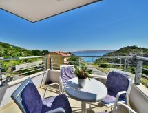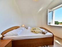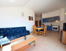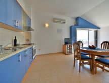 2-værelse-lejlighed 52 m2 i 2. etage, syd vendt. Pæn og hyggeligt indrettet: stue/spisestue 24 m2 med 1 dobbelt sovesofa (160 cm, længde 190 cm), sat-TV og klimaanlæg. Udgang til altan. 1 værelse med 1 dobbeltseng (2 x 80 cm, længde 200 cm). Åbent køkken (4 kogeplader, ovn). Brus/WC. Klimaanlæg (ekstra). Altan 4 m2. Havemøbler. Udsigt over havet. Til benyttelse: internet (trådløs LAN [WLAN], gratis). 1 lille husdyr/hund tilladt. Kæledyr er tilladt. Således kan hund og ejer eller ejer sammen tilbringe den bedste tid på året. Huset er også udstyret med en pool.- Faciliteter