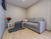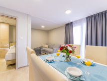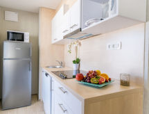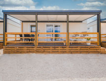 "Seaside mobile home", 3-værelse-campingvogn 39 m2. Stue/spisestue med 1 sovesofa (80 cm, længde 200 cm), sat-TV og klimaanlæg. Udgang til terrasse. 1 værelse med 1 fransk seng (150 cm, længde 200 cm). 1 værelse med 2 senge (80 cm, længde 200 cm). Åbent køkken (opvaskemaskine, 2 keramiske kogeplader, Brødrister, kedel, mikroovn, fryser, elektrisk kaffemaskine). 2 brus/WC. Terrasse 21 m2, overdækket. Havemøbler, liggestole. Ejendommen hører til en type ejendom eller lejlighed. Hytterne er 50 - 90 m fra havet og stranden. Kontakt os venligst, når du ankommer til receptionen.- Faciliteter