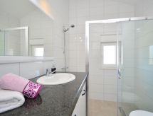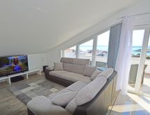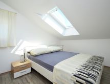 2-værelse-lejlighed 40 m2, på kvist etage, vest vendt. Pæn og moderne indrettet: stue/spisestue skrå, loftshøjde 120 - 350 cm med 1 dobbelt sovesofa (140 cm, længde 180 cm), sat-TV (fladskærms TV), klimaanlæg. Udgang til terrasse. 1 skrå værelse, loftshøjde 120 - 300 cm med 1 fransk seng (160 cm, længde 200 cm). Åbent køkken (2 kogeplader, ovn, mikroovn, fryser). Brus/bidet/WC. Terrasse 18 m2 delvis overdækket. Havemøbler. Vid udsigt over havet. Til benyttelse: hårtørrer. Internet (trådløs LAN [WLAN], gratis). Parkeringsplads (indhegnet). Der er et brusebad, og den daglige rengøring under bruseren tager ikke meget tid, så der er mere tilbage til ferien. Ejendommen er helt indhegnet. Klimaanlægget sikrer en god stuetemperatur. Fordi den følsomme faktor spiller en vigtig rolle og er vigtig for os. Velegnet til grillning. Huset er også udstyret med en internetforbindelse. Der er en ovn til rådighed.- Faciliteter