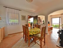 3-værelse-hus 65 m2 i 1. etage, syd øst vendt. Stue/spisestue 32 m2 med sat-TV (fladskærms TV), træovn og klimaanlæg. Udgang til altan. 1 værelse med 1 fransk seng (160 cm, længde 200 cm). Udgang til altan. 1 værelse med 1 fransk seng (140 cm, længde 200 cm). Åbent køkken (4 kogeplader, ovn, opvaskemaskine, fryser, elektrisk kaffemaskine). Brus/WC. Træ-opvarming (ekstra), varmluftsopvarming (ekstra). Altan 8 m2, terrasse 11 m2, overdækket. Havemøbler, liggestole. Herlige panoramaudsigt over havet og bugt. Til benyttelse: internet (trådløs LAN [WLAN], gratis). 1 lille husdyr/hund tilladt. Udsigt over havet og beliggenheden er smuk. En balkon er tilgængelig. Huset er også udstyret med pejs. Der er en parkeringsplads til rådighed. Hvis vejret ikke spiller, er der også et tv.- Faciliteter
