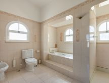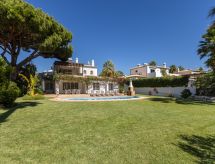 "Villa Verde", 5-værelse-villa 188 m2 på 2 etager. Rummelig, meget komfortabelt og hyggeligt indrettet: salon med åben kamin, spisebord, TV, internationale TV-kanaler, fladskærms TV, klimaanlæg og varmluft opvarming. Udgang til havesideplads, til pool. 1 værelse med 1 fransk seng (180 cm, længde 220 cm), bad/brus/bidet/toilet, klimaanlæg og varmluft opvarming. Udgang til pool. 1 værelse med 2 senge (90 cm, længde 200 cm), brus/WC, klimaanlæg og varmluft opvarming. 1 værelse med 1 fransk seng (160 cm, længde 200 cm), bad/brus/bidet/toilet, dobbelt håndvask, klimaanlæg og varmluft opvarming. Køkken (4 kogeplader, ovn, opvaskemaskine, mikroovn, fryser, elektrisk kaffemaskine). Overetage: 1 værelse med 2 senge (90 cm, længde 200 cm), bad/brus/bidet/toilet, dobbelt håndvask, klimaanlæg og varmluft opvarming. Udgang til terrasse. Havemøbler, grill, liggestole (8). Flotte udsigt over Golfbane. Til benyttelse: vaskemaskine, tørretumbler, højstol, barneseng til 3 år. Bemærk venligst: velegnet for familier. Ikke-ryger hus. Brandslukker. 74258/AL En ildsted er tilgængelig. Der er en privat pool. En opvarmet pool er tilgængelig. Du er mere selvstændig med den specielle vaskemaskine. Det har en tørretumbler.- Karakteristika for boligen