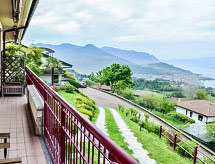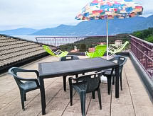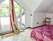 3-Zimmer-Doppelhaushälfte 65 m2 auf 2 Stockwerken, im Erdgeschoss. Zweckmässig eingerichtet: grosses Wohn-/Esszimmer mit Panoramafenster mit 1 Doppeldiwanbett und Sat-TV. Ausgang zum Balkon. 1 Doppelzimmer. Kochnische (4 Kochplatten, Backofen, Geschirrspüler, Mikrowelle, Tiefkühler, elektrische Kaffeemaschine). Bad/Bidet/WC, sep. WC. Obergeschoss: 1 Zimmer. Ausgang zur Terrasse. Sep. WC. G-Heizung (extra). Heizung nur verfügbar von 15.10. bis 15.04. Balkon, Terrasse 30 m2. Terrassenmöbel. Panoramasicht auf den See und die Berge. Zur Verfügung: Waschmaschine. Internet (Wireless LAN, gratis). Parkplatz. Bitte beachten: eigener Eingang. CIR:012092-CNI-00048 Es gibt eine Terrasse.- Ausstattung
