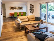 "Das Dobratsch", 5-Zimmer-Wohnung 122 m2. Hell, modern und geschmackvoll eingerichtet: Wohn-/Esszimmer mit Esstisch, Sat-TV und Flachbildschirm. 3 Doppelzimmer. 1 Zimmer mit 1 x 3 Etagenbetten. Offene Küche (Geschirrspüler, 4 Glaskeramikherd Platten, Toaster, Wasserkocher, Mikrowelle, Tiefkühler, elektrische Kaffeemaschine). 3 Duschen/WC, sep. WC. Grosser Balkon. Balkonmöbel. Sehr schöne Sicht auf den See und die Landschaft. Zur Verfügung: Safe, Haartrockner. Internet (Wireless LAN, gratis). Bitte beachten: Nichtraucher-Unterkunft. Beim Mietobjekt handelt es sich um ein Typenhaus bzw. Um eine Typenwohnung. Es hat ein drahtloses lokales Netzwerk (WLAN).- Ausstattung