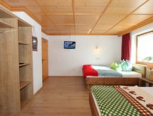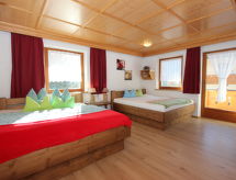 6-Zimmer-Wohnung 120 m2 im 2. Stock. Geräumig, sehr gemütlich eingerichtet: 1 Doppelzimmer. Durchgangszimmer mit 1 x 1 Etagenbetten, 1 franz. Bett (160 cm, Länge 200 cm). 1 Zimmer mit 2 Doppelbetten und Sat-TV (Flachbildschirm). Ausgang zum Balkon. 1 Zimmer mit 1 Diwanbett und 1 Doppelbett. Ausgang zum Garten. Wohn-/Schlafzimmer mit 1 Doppelbett (2 Pers.), Sat-TV (Flachbildschirm). Ausgang zur Terrasse. Wohnküche (4 Kochplatten, Backofen, Geschirrspüler) mit Essecke und Sat-TV (Flachbildschirm). Ausgang zum Balkon. Bad/WC, Dusche/WC. Grosser Balkon, Südlage und Westlage, Terrasse überdacht. Terrassenmöbel. Herrliche Panoramasicht auf die Berge und das Tal. Zur Verfügung: Haartrockner. Internet (Wireless LAN). Parkplatz (2 Autos). Bitte beachten: Nichtraucher-Unterkunft. Das Wohn-/Schlafzimmer ist ein Durchgangszimmer und verfügt über eine zusätzliche Kochnische mit Geschirrspüler, Backofen und 2-E-Platten. Diese Angebot setzt sich zusammen aus 2 nebeneinanderliegenden Wohnungen. Es steht der gesamte 2. Stock zur Verfügung. Wunderbarer Außenbereich mit zahlreichen Sitzgelegenheiten. Es hat ein Balkon. Der Besuch in der vorhandenen Sauna bringt Ihren Körper ordentlich ins Schwitzen. Ein Ofen ist verfügbar.- Charakteristik des Mietobjekts