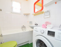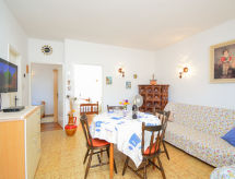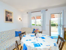 3-Zimmer-Haus 40 m2, Südwestlage. Wohn-/Esszimmer mit Sat-TV (Flachbildschirm). Ausgang zur Terrasse. 1 Zimmer mit 1 franz. Bett (160 cm, Länge 200 cm). 1 Zimmer mit 2 Betten (90 cm, Länge 190 cm). Offene Küche (4 Kochplatten, Backofen, Mikrowelle, Tiefkühler, elektrische Kaffeemaschine). Bad/WC. Terrasse 20 m2 teilweise überdacht. Terrassenmöbel. Eingeschränkte Sicht auf das Meer. Zur Verfügung: Internet (Wireless LAN, gratis). Dank der Waschmaschine die Sie vorfinden, sind weniger Kleider zum mitschleppen. Um auch mal was schnell selber zuzubereiten, steht ein Mikrowellenofen parat.- Ausstattung
