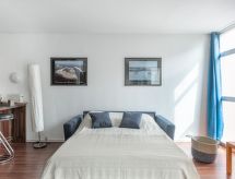 1-Zimmer-Studio 40 m2 im 4. Stock. Schön eingerichtet: Wohn-/Esszimmer mit TV (Flachbildschirm). Ausgang zum Balkon. Kabine mit 1 franz. Bett (1 x 140 cm, Länge 190 cm). Offene Küche (4 Kochplatten, Backofen, Toaster, Wasserkocher, Mikrowelle, Tiefkühler, elektrische Kaffeemaschine). Dusche/WC. E-Heizung. Balkon 3 m2, Ostlage. Balkonmöbel. Zur Verfügung: Waschmaschine, Bügeleisen, Haartrockner. Internet (Wireless LAN, extra). Parkplatz (1 Auto). Bitte beachten: Rauchmelder. Residenz. Spontane Einfälle ereignen sich oft unter der Brause. Vielleicht entsteht ihr neuer Roman oder Song in diesen Ferien! Jedenfalls ist eine Dusche zur Stelle. Ein Balkon ist vorhanden.- Charakteristik des Mietobjekts