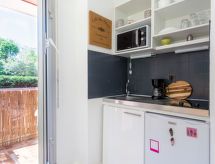 1-Zimmer-Studio 30 m2, im Erdgeschoss. Komfortabel und schön eingerichtet: Wohn-/Esszimmer mit 1 Doppeldiwanbett (1 x 140 cm, Länge 190 cm), TV (Flachbildschirm). Ausgang zur Terrasse. Kabine mit 1 Bett (90 cm, Länge 190 cm). Offene Küche (2 Glaskeramikherd Platten, Toaster, Wasserkocher, Mikrowelle, elektrische Kaffeemaschine). Dusche/WC. E-Heizung. Terrasse 10 m2, Südlage und Westlage, Terrasse 5 m2, Westlage. Terrassenmöbel. Zur Verfügung: Waschmaschine, Bügeleisen, Haartrockner. Internet (Wireless LAN, gratis). Parkplatz Nr. 688. Bitte beachten: Rauchmelder. Residenz.- Charakteristik des Mietobjekts