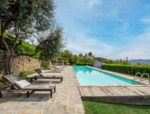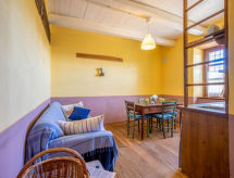"Azzuro", 2-Zimmer-Wohnung 35 m2, im Erdgeschoss. Objekt geeignet für 2 Erwachsene + 2 Kinder. Geschmackvoll und gemütlich eingerichtet: Wohn-/Esszimmer mit Esstisch und Stereoanlage. 1 Zimmer mit 1 x 2 Etagenbetten, 1 franz. Bett (160 cm). Kleine, offene Küche (2 Induktionskochplatten). Dusche/WC. Heizung. Holzböden, Natursteinböden. Gartensitzplatz. Terrassenmöbel. Panoramasicht. Zur Verfügung: Internet (Wireless LAN, gratis). Bitte beachten: Nichtraucher-Unterkunft. Maximal 1 Haustier/Hund erlaubt. Eigener Eingang. Für den Urlaub mit Hund oder Katze. Haustiere sind herzlich willkommen. In Gehweite wird ein Gastlokal betreiben. Das Haus ist auch mit einer Veranda ausgestattet.- Ausstattung