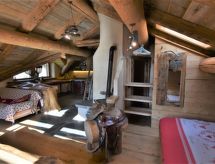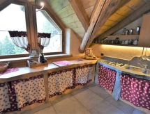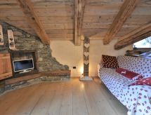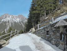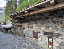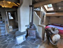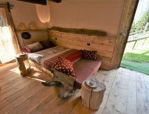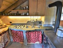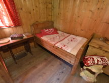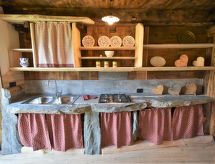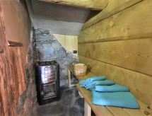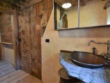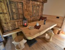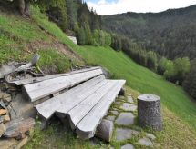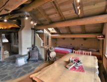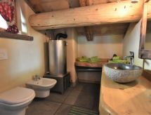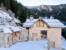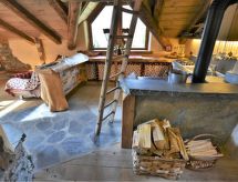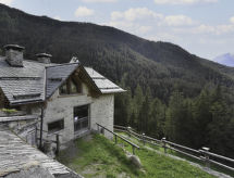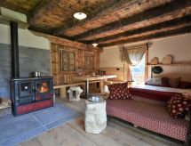 Die Berghütte BAITA FOCHIN steht abgeschieden auf 1580 m Höhe über dem Ortsteil Piandelvino im Valdidentro. Bormio 6,5 km. Livigno 34 km. Nächste Einkaufsmöglichkeit 3,2 km. Zufahrt im Sommer 1,6 km über kurvige, teils schmale, einspurige Schotterstraße (nicht für tiefergelegte Pkw geeignet). Parkmöglichkeit in Hausnähe oder vor Beginn der Schotterstraße. Auf Wunsch kümmert sich dann der Vermieter bei An-/Abreise um Gepäck- und Personentransport zum Haus. Ca. 2,2 ha großes offenes Hanggrundstück mit Wiese und angrenzendem Wald. Grundstückspflege durch den Besitzer. Auf der Hangseite Terrasse mit Holztisch, Hockern und gemauertem Grill. Weitere Terrasse mit Holztisch und Bänken. Sauna mit kleinem Tauchbecken. 6 Liegestühle. Abstellraum für Fahrräder. Schöner Panoramablick. Die Hütte eignet sich nur für hüttenerfahrene Gäste. Sie ist gemütlich und ansprechend, mit individuellem Holzmobiliar eingerichtet. Teils sichtbare Natursteinwände und Holzbalken. Stein-, Holz- und Fliesenboden. Holzofen (einzige Heizmöglichkeit). Hinweise: Warmwasser wird in einem Holzofen-Boiler aufbereitet. Es dauert ca. 30 Minuten, bis geduscht werden kann. Winter Infos: Skigebiet Cima Piazzi-San Colombano 2 km. Skiabstellraum. Im Winter Zufahrt nur bis auf 1,6 km möglich (Parkmöglichkeit). Von hier Gepäck- und Personentransport zum Haus mit Schneemobil durch den Vermieter (ohne Berechnung bei An-/Abreise, weitere Fahrten auf Wunsch gegen Bezahlung). Alternativ Zugang zu Fuß über präparierten Wanderweg. Die Ferienunterkunft liegt mitten in einem Wintersport und Skigebiet mit Pisten für jeden Geschmack und jede Könner Stufe.Interior