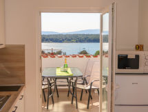 "Barbara (PUT122)", 2-Zimmer-Wohnung 32 m2 im 2. Stock. Objekt geeignet für 2 Erwachsene + 2 Kinder. 1 Zimmer mit 1 franz. Bett (160 cm, Länge 200 cm), Sat-TV und Klimaanlage. Ausgang zur Terrasse. 1 Zimmer mit 2 Betten (85 cm, Länge 185 cm). Wohnküche (2 Kochplatten, Toaster, Wasserkocher, Mikrowelle, elektrische Kaffeemaschine) mit Esstisch. Ausgang zur Terrasse. Dusche/WC. Terrasse 12 m2. Terrassenmöbel, Gartengrill, Liegestühle. Sicht auf das Meer. Zur Verfügung: Internet (Wireless LAN, gratis). Maximal 3 Haustiere/Hunde erlaubt. Überdies werden sie verwöhnt mit einem freien Blick auf das Meer. Das Haus ist auch mit einem drahtlosen lokalen Netzwerk (WLAN) ausgestattet.- Ausstattung