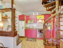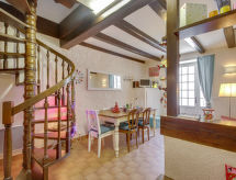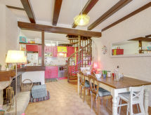 "La Bisquine", 3-Zimmer-Reihenhaus 65 m2. Zweckmässig und schön eingerichtet: Wohn-/Esszimmer mit TV (Flachbildschirm). Kleine, offene Küche (4 Kochplatten, Backofen, Geschirrspüler, Mikrowelle). Obergeschoss: (Wendeltreppe) 1 Zimmer mit 2 Betten (90 cm, Länge 190 cm). Ausgang zum Balkon. Bad, sep. WC. E-Heizung, Boiler. 2. Obergeschoss: 1 Zimmer mit 1 franz. Bett (1 x 140 cm, Länge 190 cm). Zur Verfügung: Waschmaschine, Wäschetrockner, Bügeleisen, Haartrockner. Bitte beachten: für Kleinkinder nicht geeignet. Nichtraucher-Haus. Rauchmelder. Eine Badewanne ist verfügbar. Ein Geschirrspüler ist vorhanden. Sollte das Wetter einmal nicht mitspielen, ist auch ein Fernseher vorhanden. Eine Waschmaschine ist zum gebrauch vorhanden. Das Haus ist auch mit einem Wäschetrockner ausgestattet. Es gibt ein Ofen.- Ausstattung