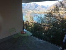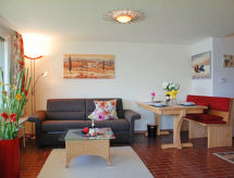 "Appartment EG", 2-Zimmer-Wohnung 44 m2, im Erdgeschoss, Südwestlage. Objekt geeignet für 2 Erwachsene + 2 Kinder. Hell, komfortabel eingerichtet: offenes Wohn-/Schlafzimmer mit Panoramafenster mit 1 Diwanbett (140 cm, Länge 200 cm), Esstisch und Sat-TV (Flachbildschirm), E-Heizung. Ausgang zur Terrasse. 1 Doppelzimmer mit 1 Doppelbett (2 x 90 cm, Länge 200 cm). Ausgang zur Terrasse. Kleine Küche im Eingang (4 Glaskeramikherd Platten, elektrische Kaffeemaschine, Kapseln für die Kaffeemaschine(PADS) Senseo) extra). Dusche/WC. E-Heizung. Nordlage und Westlage. Terrassenmöbel, Gartengrill, Liegestühle (2). Herrliche Panoramasicht auf den See, die Berge und die Landschaft. Zur Verfügung: Bügeleisen, Kinderhochstuhl, Babybett bis 2 Jahre (extra), Haartrockner. Internet (Wireless LAN, gratis). Parkplatz (überdacht, 1 Auto) beim Haus. Bitte beachten: Nichtraucher-Unterkunft. 1 Haustier/Hund erlaubt. Feuerlöscher. Soll der geliebte Hund während der Ferienzeit in einer Tierunterkunft untergebracht werden? Nein, der Vierbeiner gehört zur Familie und ohne ihn ist ein perfekter Urlaub praktisch undenkbar und deshalb hier gern gesehen. Eine Terrasse ist verfügbar. Eine Veranda ist verfügbar. Geeignet zum Grillen. Ein überdachter Parkplatz ist verfügbar. Ein Pool ist vorhanden. Frische Bettwäsche verfügbar. Mit Reinigung.- Ausstattung