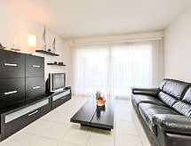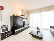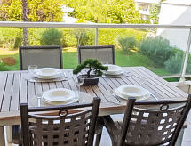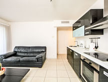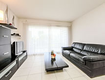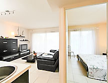2-Zimmer-Wohnung 45 m2 im 2. Stock. Schön und modern eingerichtet: Wohn-/Esszimmer mit 1 Doppeldiwanbett (140 cm, Länge 190 cm), TV, Radio, CD, DVD und Klimaanlage. Ausgang zur Terrasse. 1 Zimmer mit 1 franz. Bett (160 cm, Länge 200 cm), Klimaanlage. Ausgang zur Terrasse. Offene Küche (4 Kochplatten, Backofen, Geschirrspüler, Mikrowelle). Dusche/Bidet/WC. E-Heizung. Terrasse 16 m2, überdacht, Nordwestlage. Terrassenmöbel. Zur Verfügung: Waschmaschine. Internet (Wireless LAN, extra). Garage Nr. 28, Höhe 220 cm, Breite 220 cm. Bitte beachten: TV nur FR. Rauchmelder. Bitte beachten: im Wohnzimmer ist kein Esstisch vorhanden. 06029003758SB Ein Geschirrspüler ist verfügbar. Es hat ein Parkplatz. Es hat ein DVD Spieler. Ein Ofen ist verfügbar.- Charakteristik des Mietobjekts