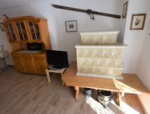 2-Zimmer-Wohnung 55 m2, im Zwischenstock, Südlage. Hell, zweckmässig und komfortabel eingerichtet: grosses Wohn-/Esszimmer mit 1 Doppeldiwanbett und Schwedenofen (nur Deko), TV (Flachbildschirm). Ausgang zur Terrasse. 1 Zimmer mit 2 Betten. Ausgang zur Terrasse. Kochnische (4 Kochplatten, Backofen, Mikrowelle). Dusche/Bidet/WC. Terrasse 15 m2. Terrassenmöbel. Panoramasicht auf die Berge und das Tal. Zur Verfügung: Waschmaschine, Haartrockner. Bitte beachten: Nichtraucher-Unterkunft. 1 Haustier/Hund erlaubt. Kein Fahrstuhl. CIPAT 022039-AT-061633 Unabhängiger sind Sie mit der eigens vorhandenen Waschmaschine.- Ausstattung