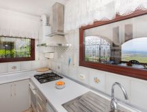 "Christa", 4-Zimmer-Haus 150 m2 auf 2 Stockwerken. Zweckmässig eingerichtet: Wohn-/Esszimmer mit Digital-TV. Ausgang zur Terrasse. 1 Zimmer mit 1 franz. Bett (150 cm, Länge 190 cm). 1 Zimmer mit 2 Betten (90 cm, Länge 190 cm). Küche (4 Kochplatten, Backofen, Toaster, Wasserkocher, Mikrowelle, Tiefkühler, elektrische Kaffeemaschine). Dusche/WC. Unteres Geschoss: 1 Zimmer mit 1 franz. Bett (135 cm, Länge 190 cm). Dusche/WC. Gartensitzplatz. Terrassenmöbel, Gartengrill, Liegestühle. Panoramasicht auf das Meer, die Berge und die Landschaft. Zur Verfügung: Waschmaschine, Bügeleisen, Kinderhochstuhl, Babybett, Haartrockner. Internet (Wireless LAN, gratis). HUTG-058913 Mit eingezäuntem Grundstück. Überdies werden sie verwöhnt mit einem freien Blick auf das Meer. Ein privater Pool ist vorhanden. Unabhängiger sind Sie mit der eigens vorhandenen Waschmaschine. Das Haus ist auch mit einem Internetanschluss ausgestattet.- Ausstattung