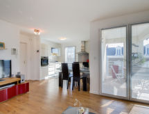 3-Zimmer-Wohnung 50 m2 im 2. Stock, Südwestlage. Komfortabel und schön eingerichtet: Wohn-/Esszimmer mit Panoramafenster mit TV (Flachbildschirm), Heimkino. Ausgang zur Terrasse. 1 Zimmer mit 1 franz. Bett (1 x 140 cm, Länge 190 cm), TV (Flachbildschirm). 1 Zimmer mit 1 franz. Bett (1 x 140 cm, Länge 190 cm). Offene Küche (Backofen, Geschirrspüler, 3 Induktionskochplatten, Mikrowelle, elektrische Kaffeemaschine). Dusche, sep. WC. E-Heizung. Kleine Terrasse 7 m2, Südlage und Westlage. Terrassenmöbel. Zur Verfügung: Waschmaschine, Bügeleisen, Kinderhochstuhl, Babybett, Haartrockner. Internet (Wireless LAN, gratis). Garage. Bitte beachten: Wohnung auf Strassenseite. TV nur FR. Rauchmelder. 35288000518F9 Ein Babybett ist vorhanden. Ein Ofen ist verfügbar.- Ausstattung