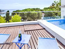 "Crystal", 5-Zimmer-Reihenhaus 223 m2 auf 4 Stockwerken. Geräumig, komfortabel und stilvoll eingerichtet: 1 Zimmer mit 1 franz. Bett (150 cm, Länge 190 cm), Klimaanlage und Warmluftheizung. Ausgang zur Terrasse mit 1 franz. Bett (150 cm, Länge 190 cm), Bad/WC, Klimaanlage und Warmluftheizung. Ausgang zur Terrasse mit 1 x 2 Etagenbetten (80 cm, Länge 190 cm), Klimaanlage und Warmluftheizung. Dusche/WC. Klimaanlage, Warmluftheizung. Unteres Geschoss: Zwischenstock. Obergeschoss: Wohn-/Esszimmer mit Sat-TV. Ausgang zur Terrasse. Küche (Backofen, Geschirrspüler, 4 Glaskeramikherd Platten, Toaster, Wasserkocher, Mikrowelle, Tiefkühler, elektrische Kaffeemaschine). Terrassenmöbel, Liegestühle. Panoramasicht auf die Berge und das Meer. Zur Verfügung: Waschmaschine, Wäschetrockner, Bügeleisen, Babybett, Haartrockner. Internet (Wireless LAN, gratis). Bitte beachten: Nichtraucher-Haus. HUTG-034191 Bequem mit dem Lift bis vor die Haustür. Mit eingezäuntem Grundstück. Mit Aussicht aufs Meer. Die drückende Hitze kann Körper und Gemüt stark belasten. Deshalb sind die Räumlichkeiten mit Klimaanlagen ausgestattet. Ein Pool ist verfügbar. Es hat ein privater Pool. Ein Mikrowellenofen steht zur Verfügung.- Charakteristik des Mietobjekts