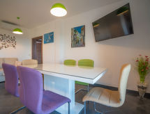 3-Zimmer-Wohnung 60 m2, im Erdgeschoss, Südlage. Wohn-/Esszimmer mit 1 Diwanbett (120 cm, Länge 155 cm), Kabel-TV und Internationale TV-Sender (Flachbildschirm), Klimaanlage. Ausgang zur Terrasse. 2 Zimmer, jedes Zimmer mit 1 franz. Bett (160 cm, Länge 200 cm), Klimaanlage. Offene Küche (Backofen, Geschirrspüler, 4 Glaskeramikherd Platten, Tiefkühler, elektrische Kaffeemaschine). Bad/Bidet/WC. Terrasse 25 m2. Terrassenmöbel, Liegestühle. Eingeschränkte Sicht auf das Meer. Zur Verfügung: Waschmaschine, Haartrockner. Internet (Wireless LAN, gratis). Garage (2 Autos). Bitte beachten: eigener Eingang. Türsprechanlage. Schlafsofa (120 cm, Länge 155 cm) im Wohn-/Esszimmer, nur für 1 Kind bis 12 Jahre. Eine Badewanne ist vorhanden. Damit es auch im Sommer angenehm kühl bleibt, verfügt dieses Ferienobjekt über eine Klimaanlage. Sollte das Wetter einmal nicht mitspielen, ist auch ein Fernseher vorhanden. Unabhängiger sind Sie mit der eigens vorhandenen Waschmaschine.- Ausstattung
